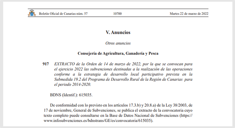 917 EXTRACTO de la Orden de 14 de marzo de 2022, por la que se convocan para el ejercicio 2022 las subvenciones destinadas a la realización de las operaciones conforme a la estrategia de desarrollo local participativo prevista en la Submedida 19.2 del Programa de Desarrollo Rural de la Región de Canarias para el periodo 2014-2020.
