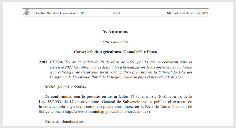 2283 EXTRACTO de la Orden de 19 de abril de 2021, por la que se convocan para el ejercicio 2021 las subvenciones destinadas a la realización de las operaciones conforme a la estrategia de desarrollo local participativo previstas en la Submedida 19.2 del Programa de Desarrollo Rural de la Región Canaria para el periodo 2014-2020.