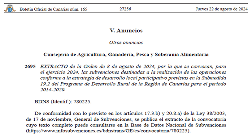 EXTRACTO de la Orden de 8 de agosto de 2024, por la que se convocan, para el ejercicio 2024, las subvenciones destinadas a la realización de las operaciones conforme a la estrategia de desarrollo local participativo previstas en la Submedida 19.2 del Programa de Desarrollo Rural de la Región de Canarias para el periodo 2014-2020.