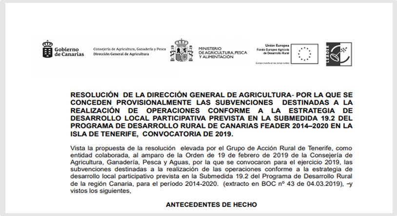 desarrollo local participativo prevista en la Submedida 19.2 del Programa de Desarrollo Rural de la región Canaria, para el período 2014-2020. (extracto en BOC nº 43 de 04.03.2019), y