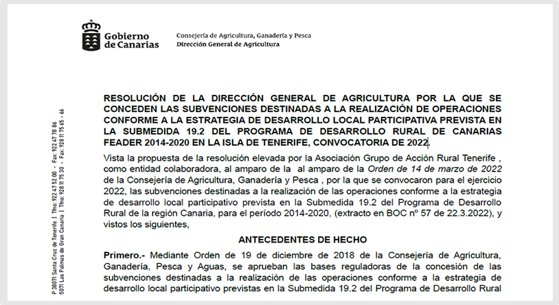 RESOLUCIÓN DE LA DIRECCIÓN GENERAL DE AGRICULTURA POR LA QUE SE CONCEDEN LAS SUBVENCIONES DESTINADAS A LA REALIZACIÓN DE OPERACIONES CONFORME A LA ESTRATEGIA DE DESARROLLO LOCAL PARTICIPATIVA PREVISTA EN LA SUBMEDIDA 19.2 DEL PROGRAMA DE DESARROLLO RURAL DE CANARIAS FEADER 2014-2020 EN LA ISLA DE TENERIFE, CONVOCATORIA DE 2022.